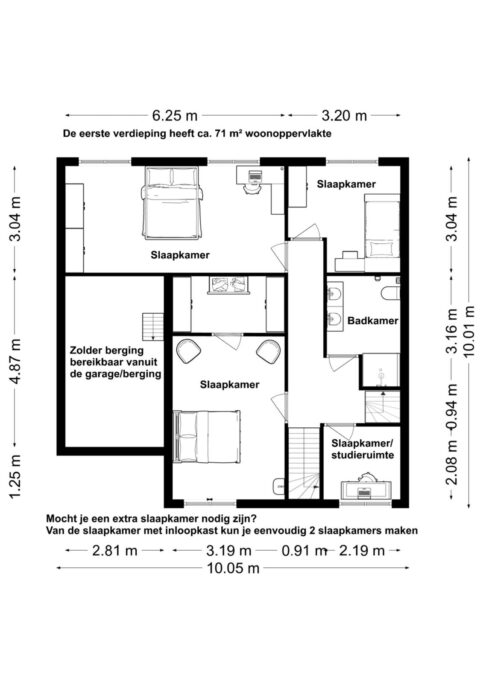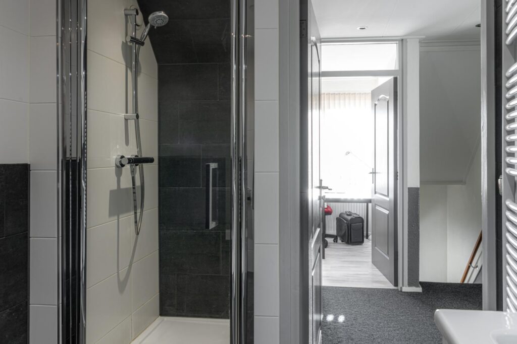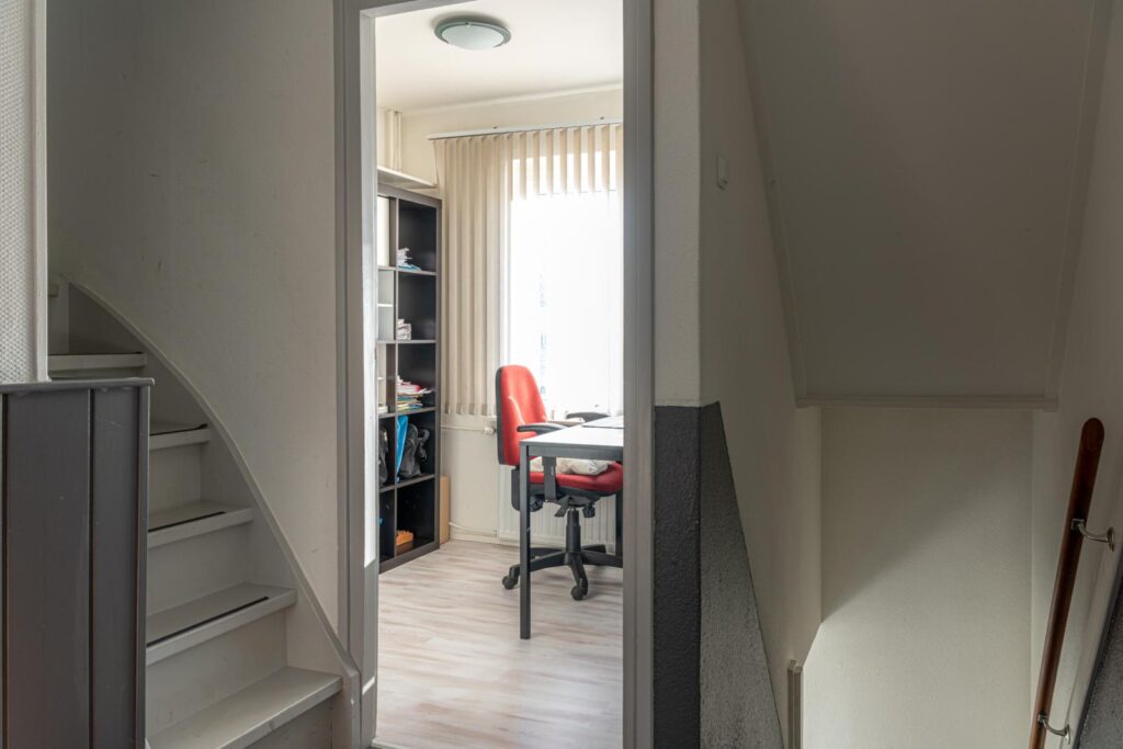 Via de trap in de hal naar de eerste verdieping. De uitbouw op de begane grond is naar boven toe helemaal doorgetrokken waardoor je hier net zoveel woonruimte hebt als op de begane grond (ca. 71 m²). Er zijn twee kleinere slaapkamers en twee ruime slaapkamers. Waarvan de middelste een inloopkast heeft. De badkamer is erg netjes en modern betegeld en heeft een inloopdouche, een toilet en dubbele wastafel met lades eronder.