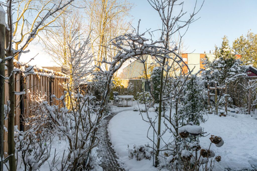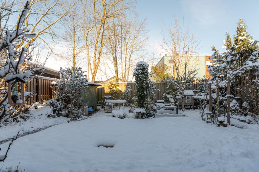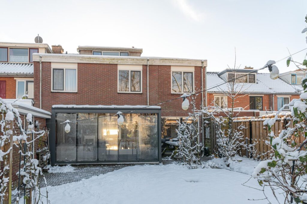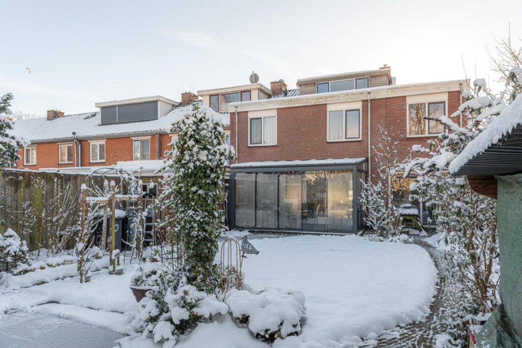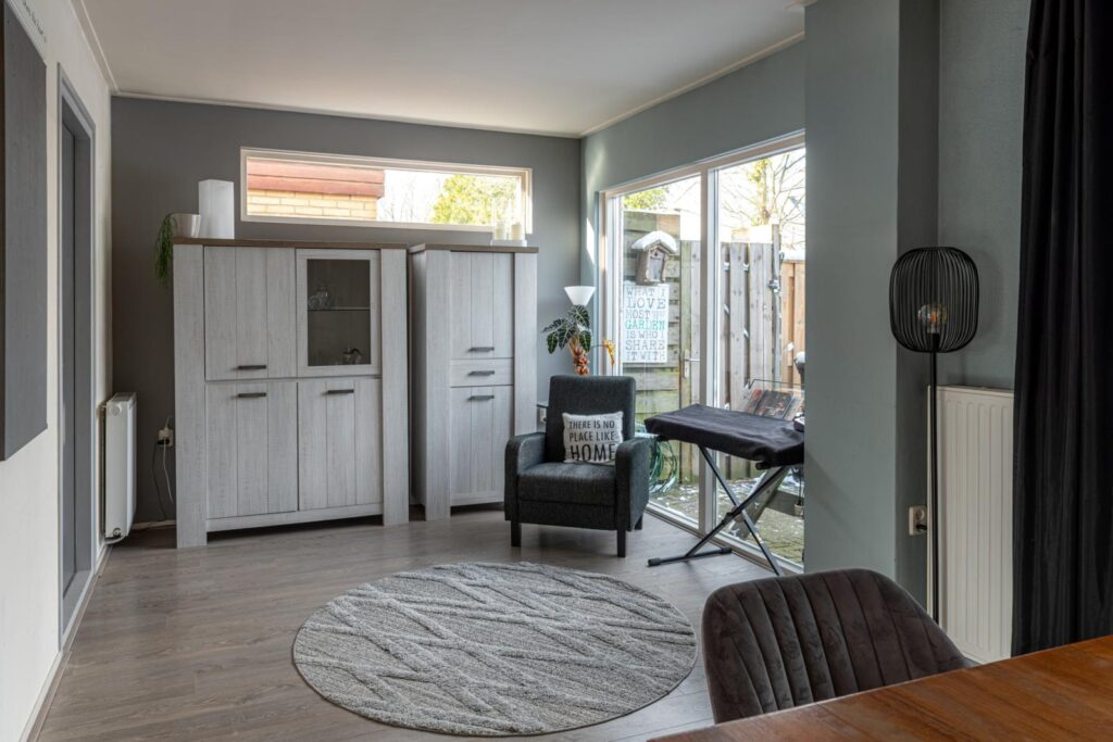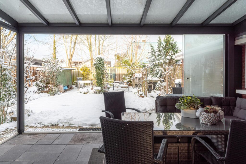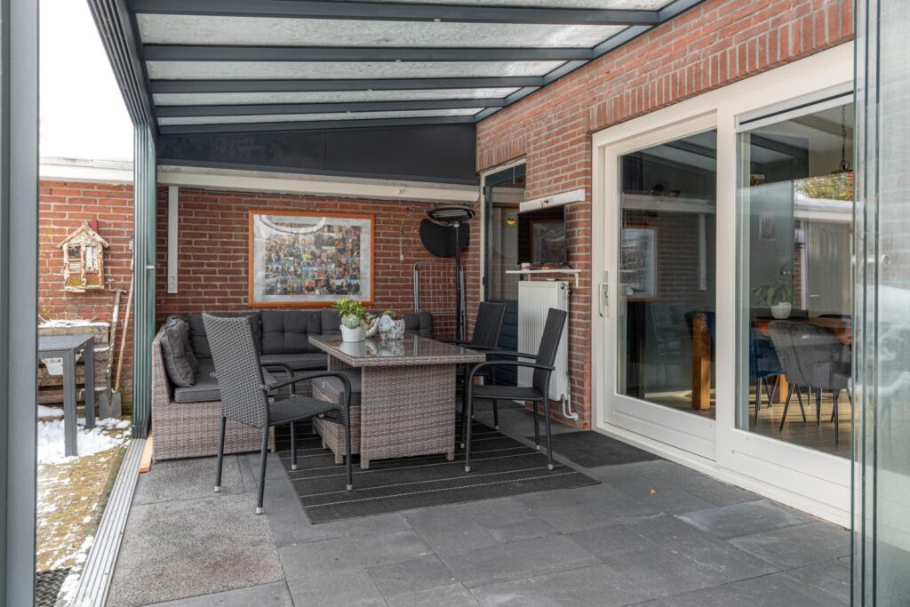 Natuurlijk mag je via voordeur binnenkomen, maar de serre achter in de tuin staat ook open. In dat geval kom je direct in de achtertuin en kun je meteen genieten van de ruimte en het groen.