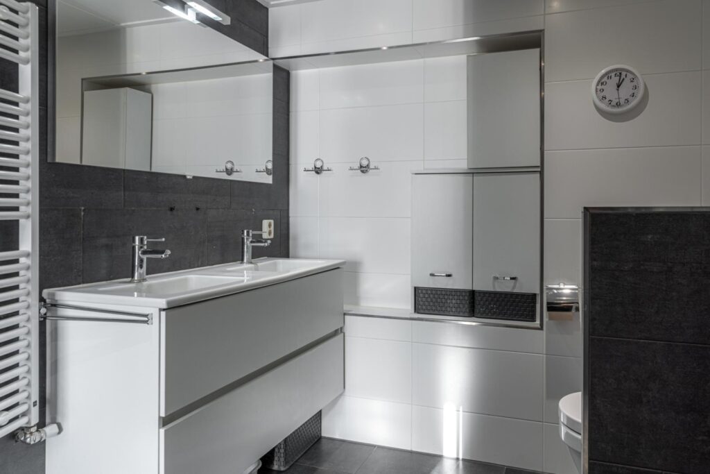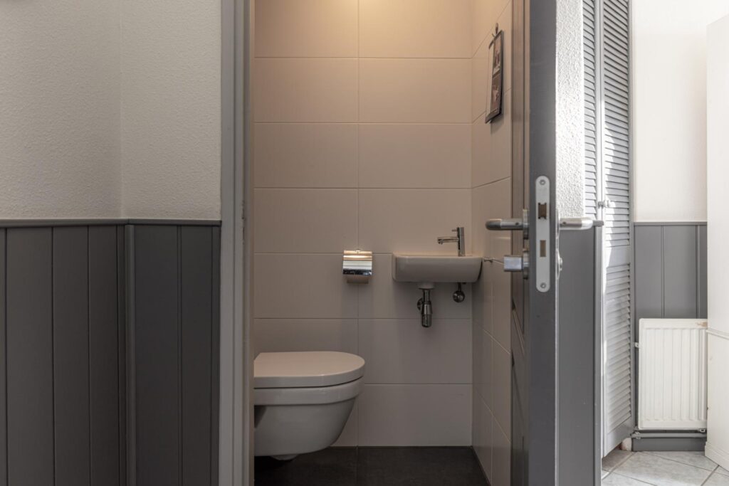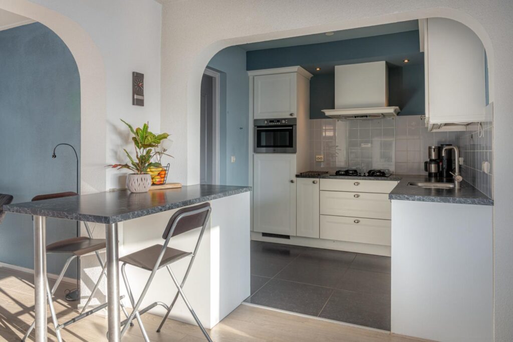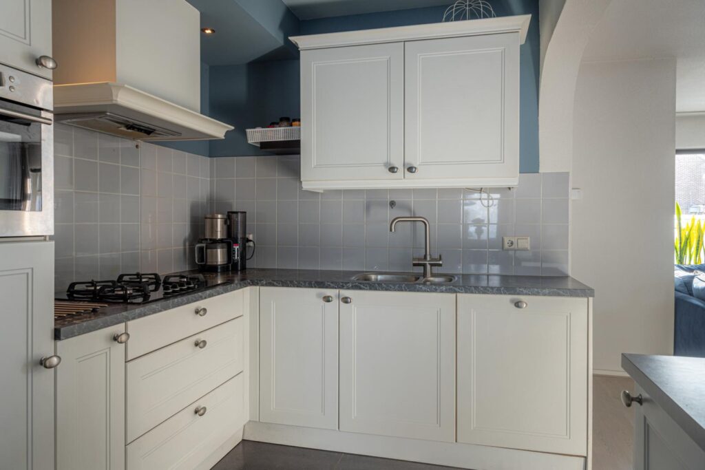 De keuken, voorzien van inbouwapparatuur, ligt centraal tussen de woonkamer en de eetkamer. Aansluitend vind je de bijkeuken met aansluitingen voor wasmachine en droger, evenals ruimte voor extra voorraad of een koelkast/vriezer.