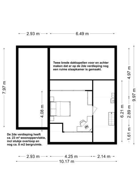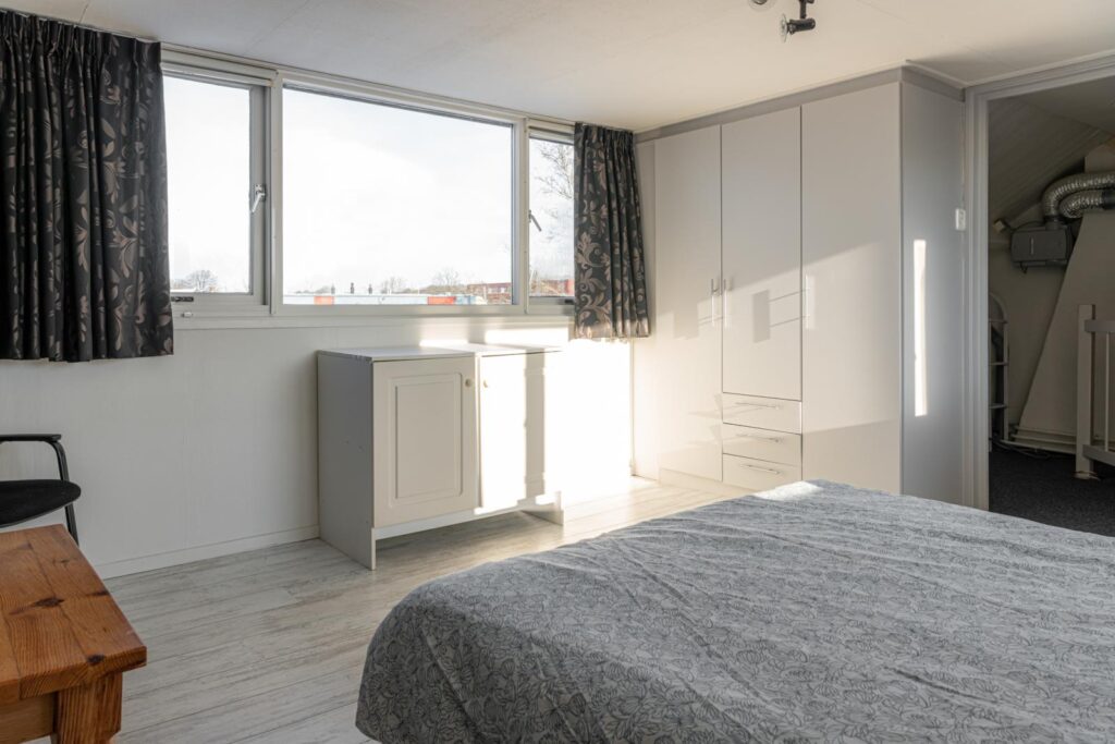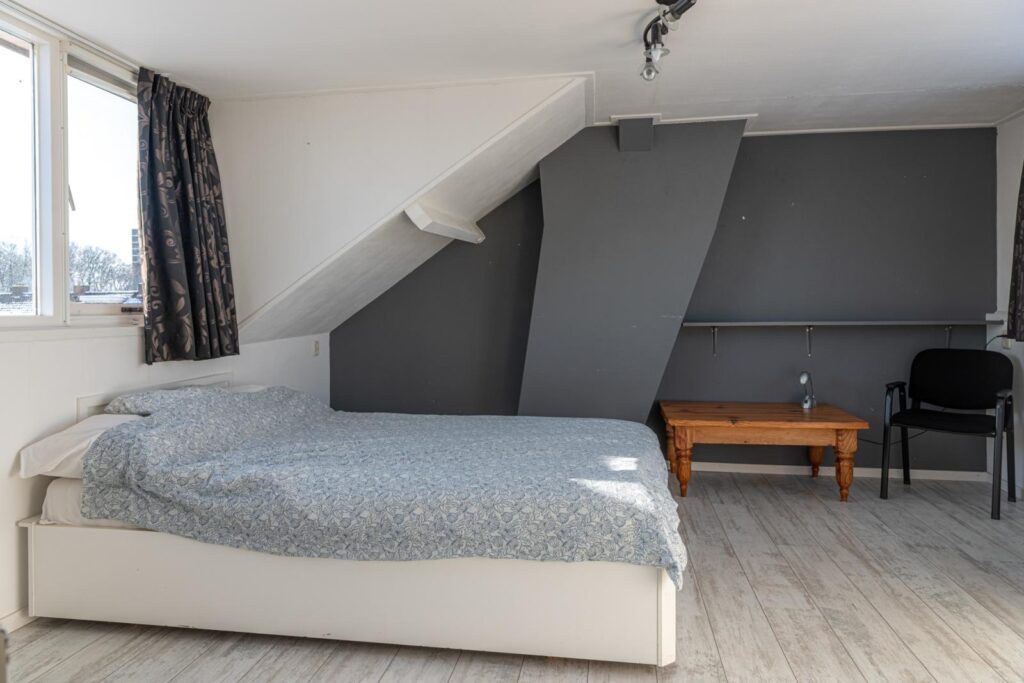 Een tweede vaste trap naar de tweede verdieping. Hier zijn aan de voorzijde en de achterzijde dakkapellen geplaatst. Er is dus genoeg ruimte gecreëerd voor een extra slaapkamer van ca. 17 m². Ook hier is weer bergruimte en de cv-ketel en mechanische ventilatie hangt hier op de overloop.