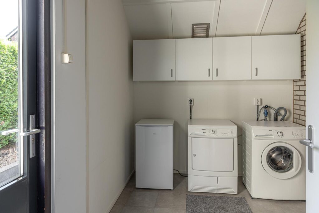 De bijkeuken met was en droogmachine aansluitingen. Ook hier veel bergruimte voor voorraadkasten of een extra koelkast of vriezer. Er is een zoldertje boven de bijkeuken waar de cv-ketel hang.