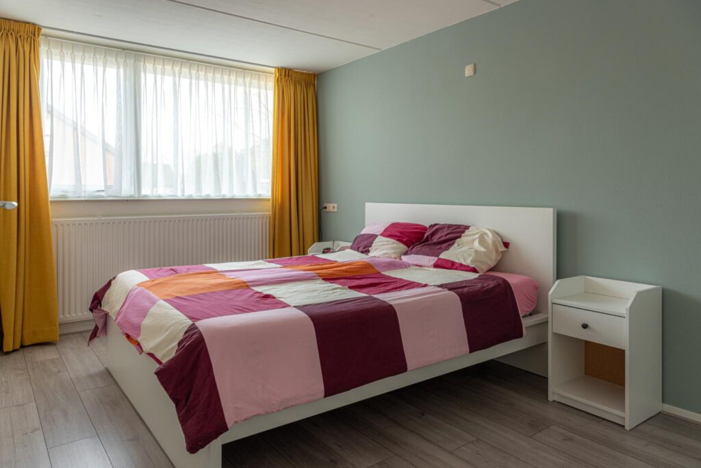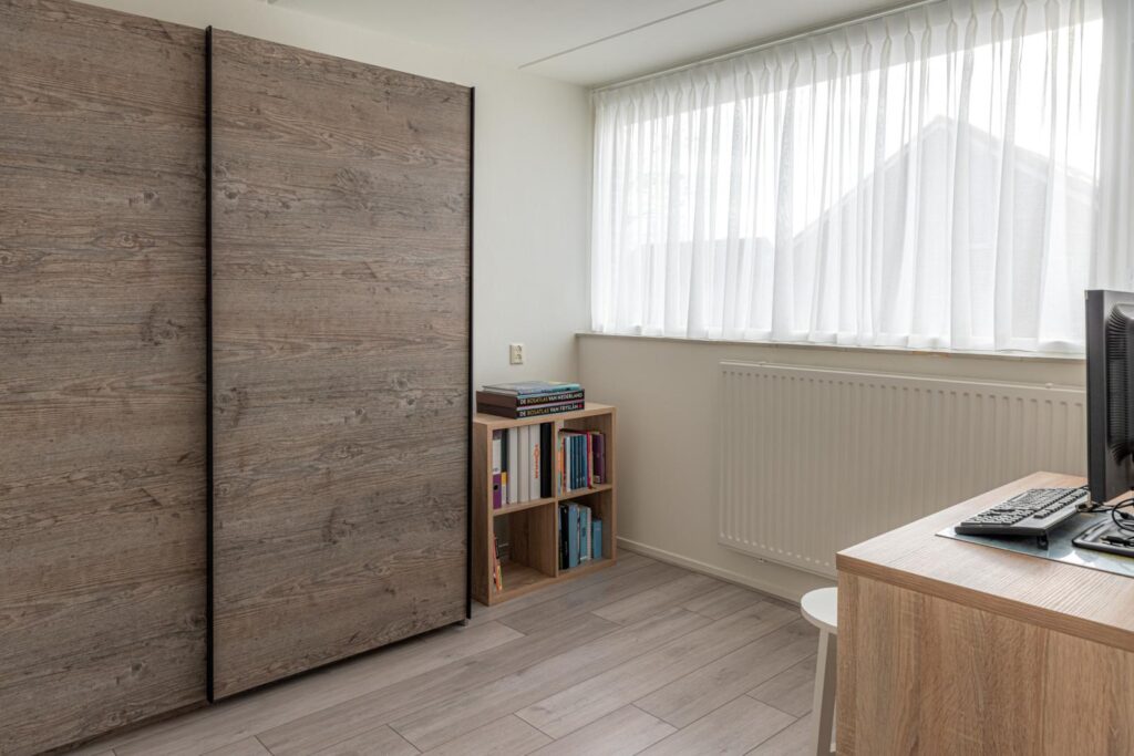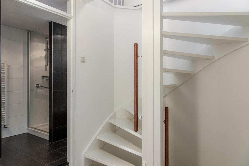 De trap naar de verdieping is verscholen achter een deur tussen de woonkamer en keuken. Op de verdieping zijn 3 slaapkamers en een moderne badkamer. De slaapkamers zijn netjes, ruim en klaar voor de nieuwe bewoners. De badkamer heeft een inloopdouche, wastafel met aan weerszijden fraaie kasten en een toilet. Alles fraai afgewerkt met een moderne tegel en kleur.