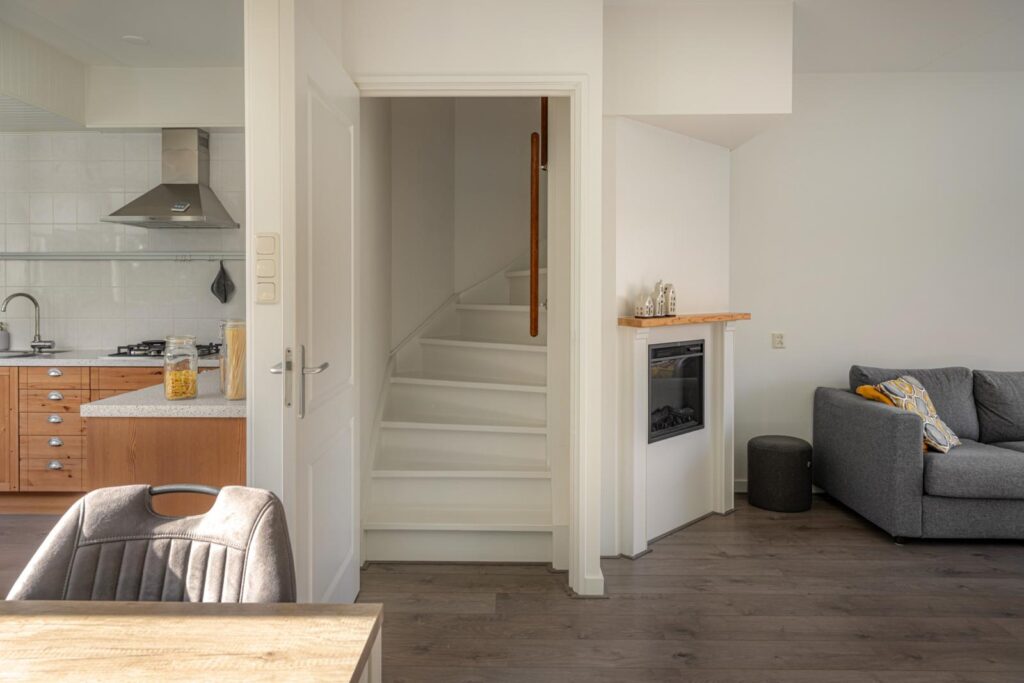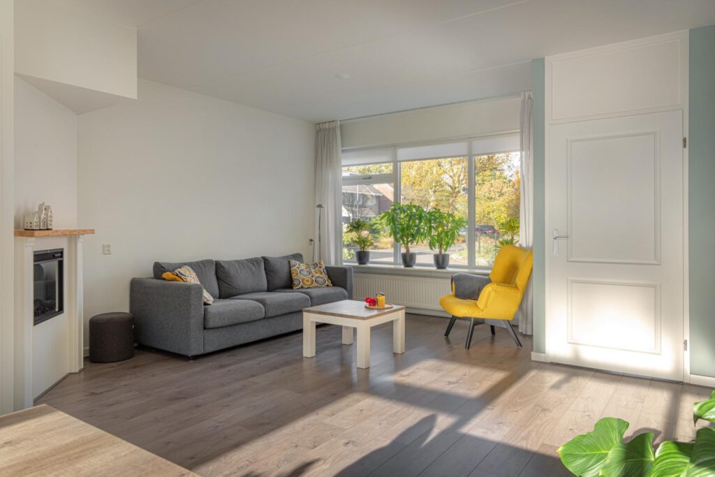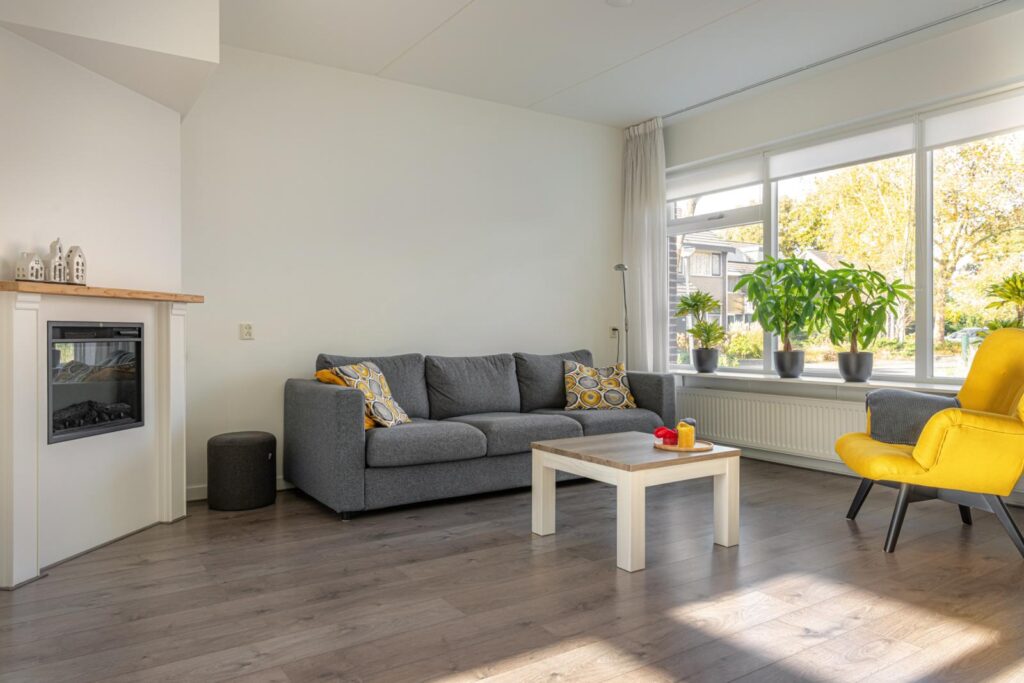 Entree, hal toilet en meterkast. Door naar de woonkamer, hier valt meteen de ruimte en het licht op wat binnenvalt door de grote ramen voor en achter. Er is een leuke elektrische sfeerkachel die ook nog wat extra warmte geeft.