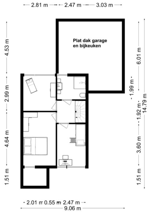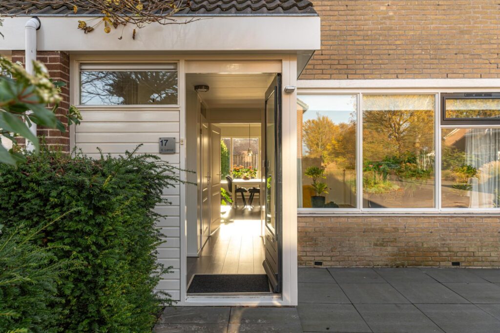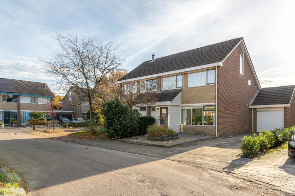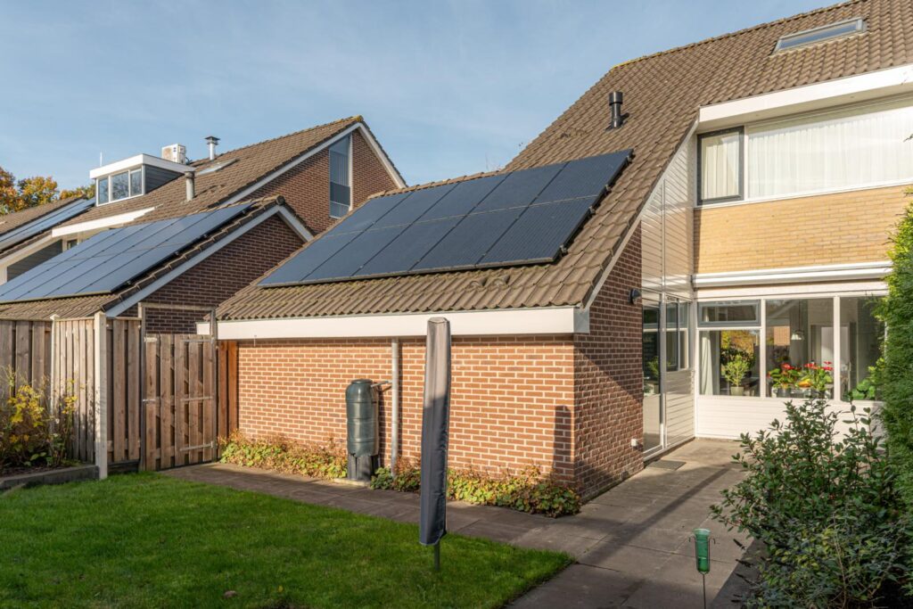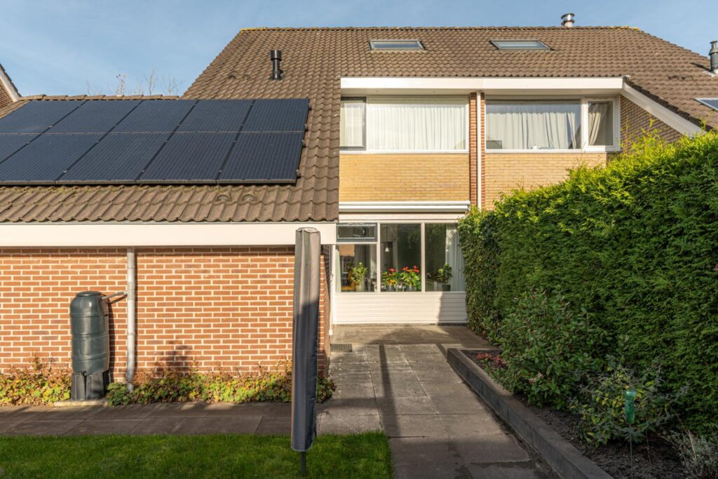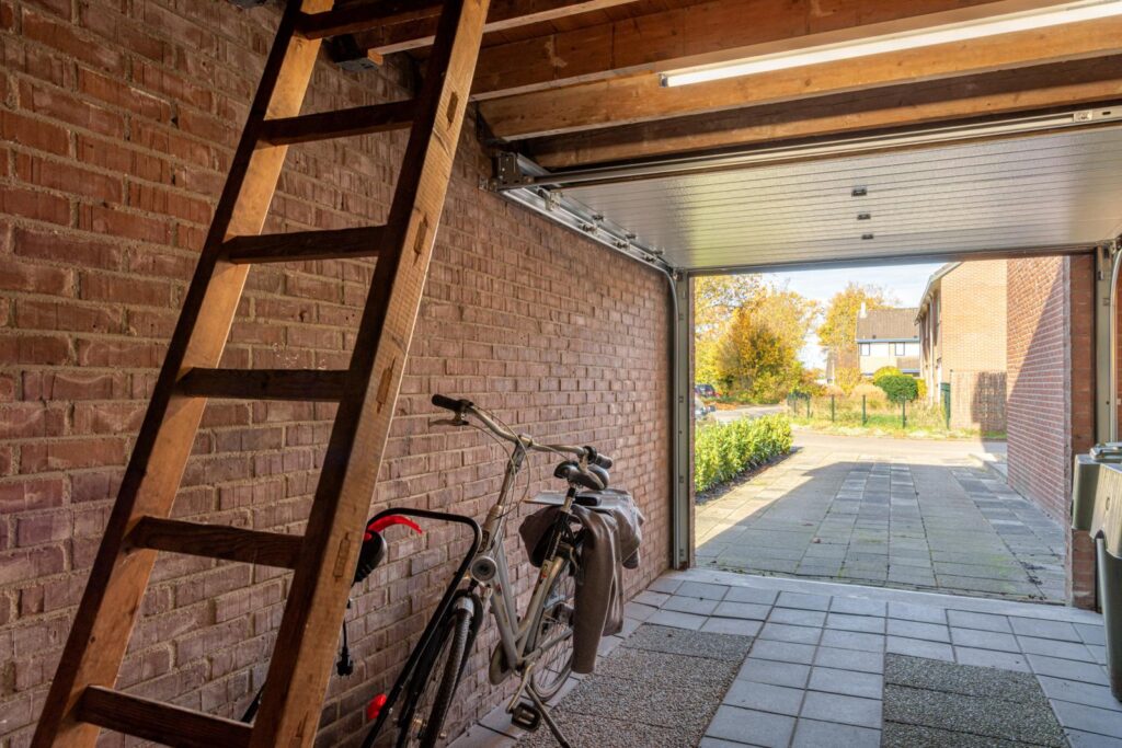 In de bijkeuken een deur naar je tuin op het zuiden maar ook een deur naar de garage. Die is dus inpandig zoals dat heet. Ook hier is weer een bergzolder boven. Op de zuidzijde van het dak op de garage liggen 10 zonnepanelen. Aan de voorzijde een kunststof sectionaal deur met afstandsbediening.