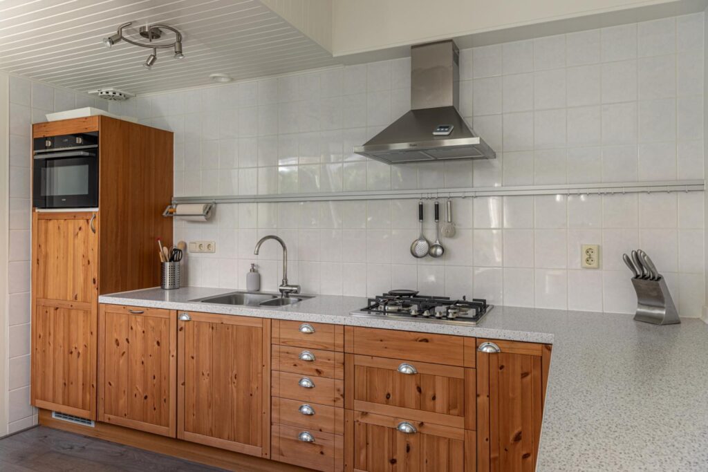De keuken heeft inbouw vaatwasser, koelkast, combi-oven, 4 pits gaskookplaat en rvs-schouw erboven. Verder veel bergruimte en een ruime werkplek om lekker te kokkerellen.